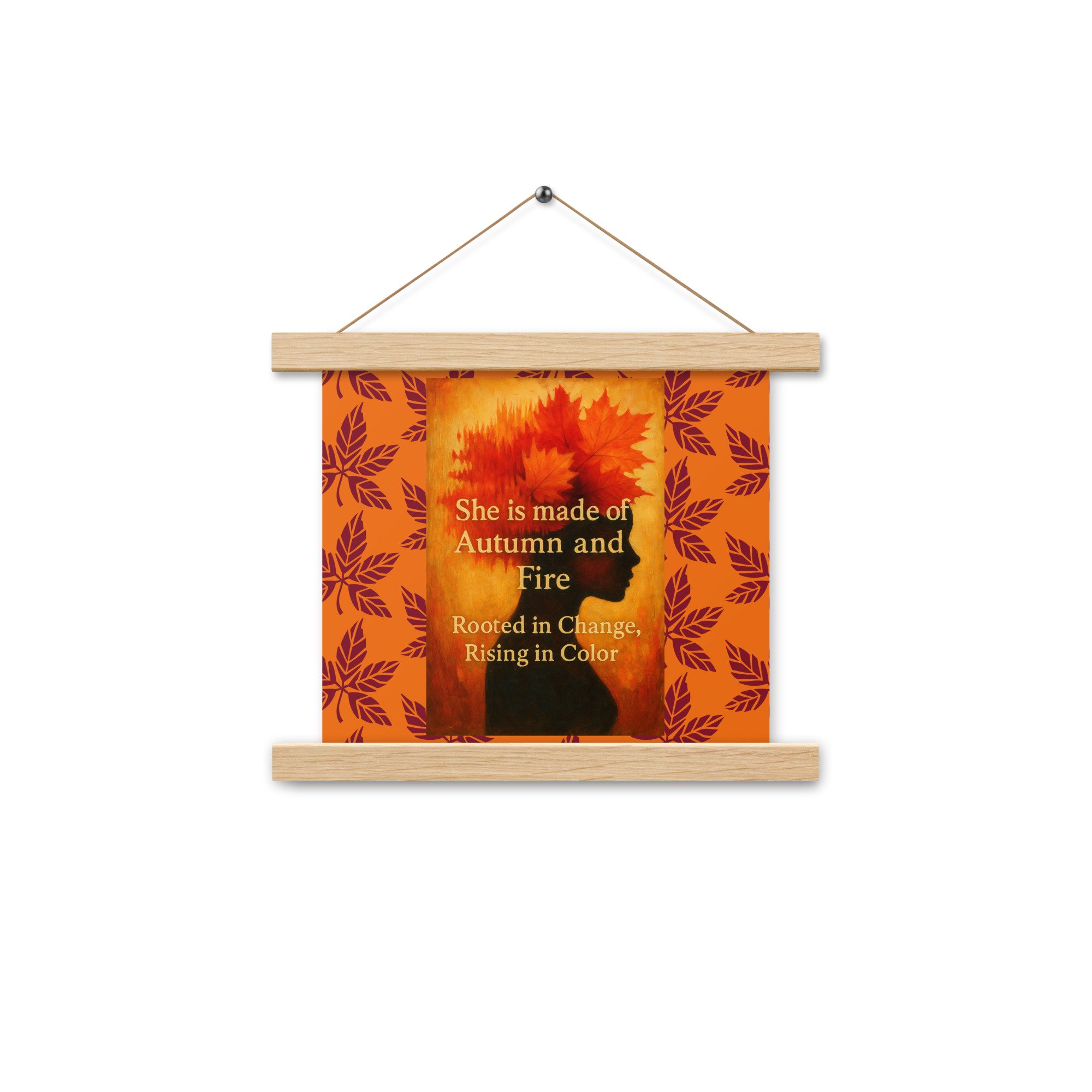 Celebrate autumn and empowerment with this striking poster of a woman whose hair flows into delicate leaves. Printed on high-quality matte paper and paired with a sleek wooden hanger, it’s a stylish, lightweight alternative to traditional framing—perfect for any decor.