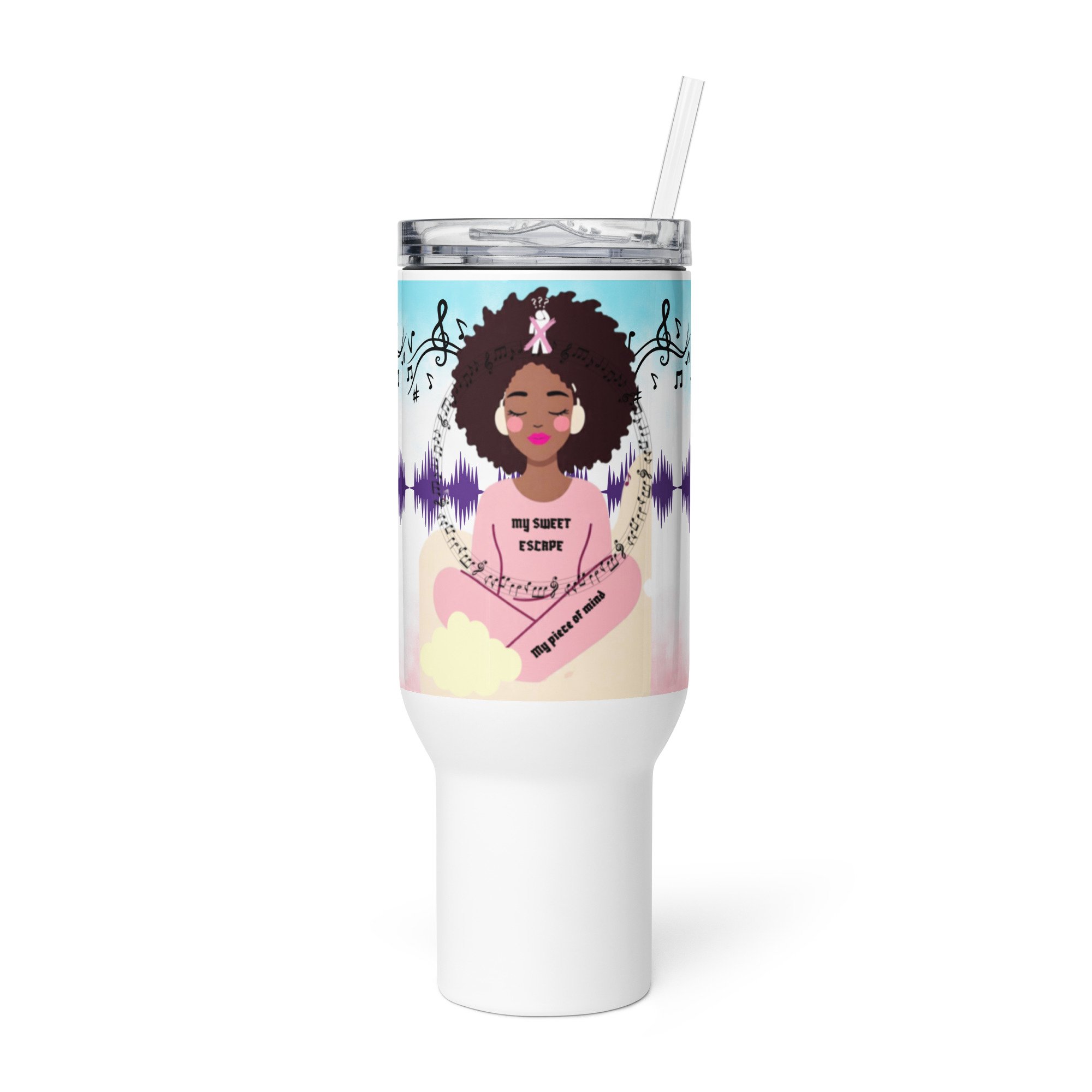 Bring a little escape into your day. This pastel blue and pink travel mug features a serene illustration of a woman floating on clouds, lost in her music and drifting into her sweet escape. It’s the perfect companion for anyone who loves calming vibes, artful designs, and drinks that stay the right temperature on the go.